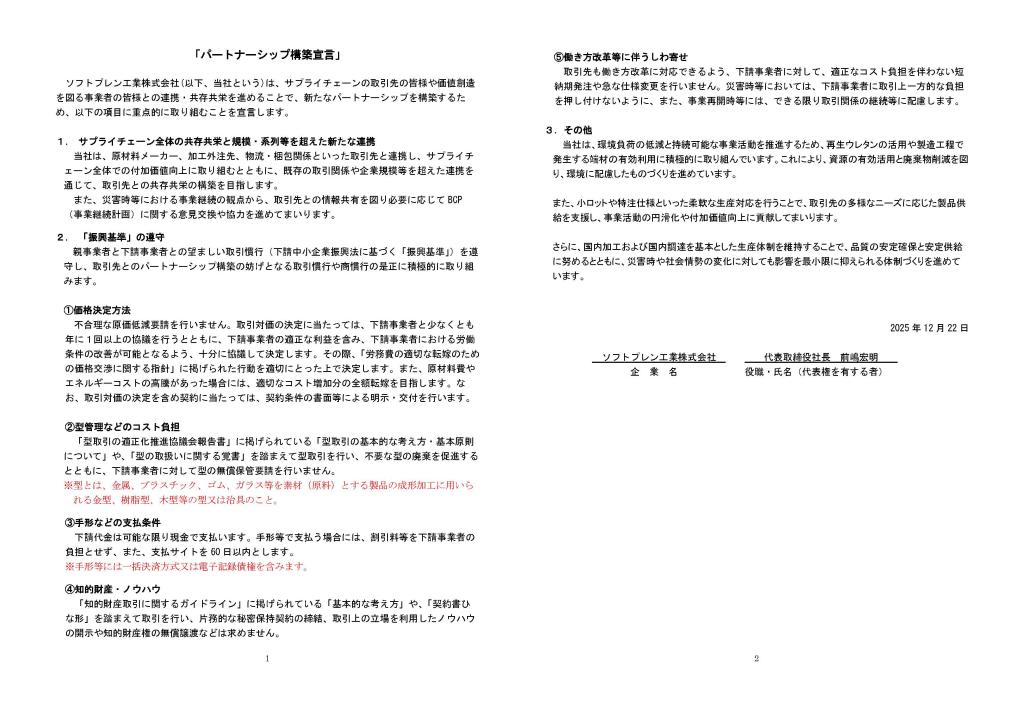 ソフトプレン工業株式会社はこのたび当社は、「パートナーシップ構築宣言」を行いました。